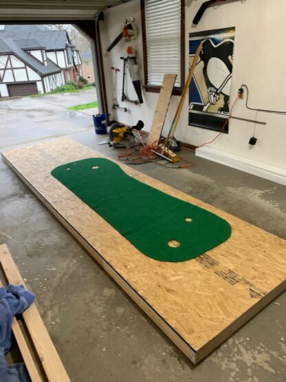 • You can adjust this build to whatever size you want to make it.The only tricky part may be making sure the underlayment is perfectly flush if you have to use more than 1 piece.We suggest planning 4′ width increment greens since the particle board comes at 4′ standard from local shops.