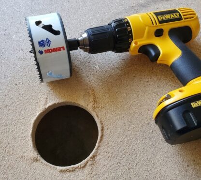 Drill holes using hole saw – 4 1/4″. Product link: https://amzn.to/3eQ53Ar